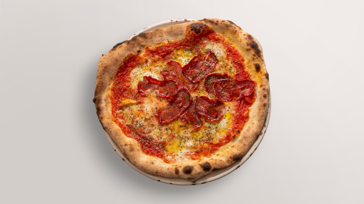 mit San Marzano DOP-Tomaten, Mozzarella Fior di Latte di Agerola, scharfer italienischer Salami (Spianata Calabrese, Schweinefleisch), roten Zwiebeln, schwarzen Oliven und Olivenöl