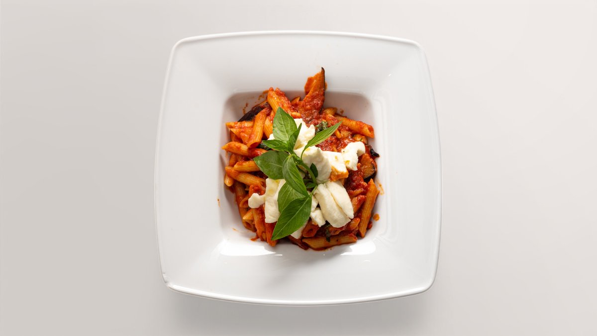 mit neapolitanischer Tomatensoße, Pinienkernen, Auberginen und Büffelmozzarella