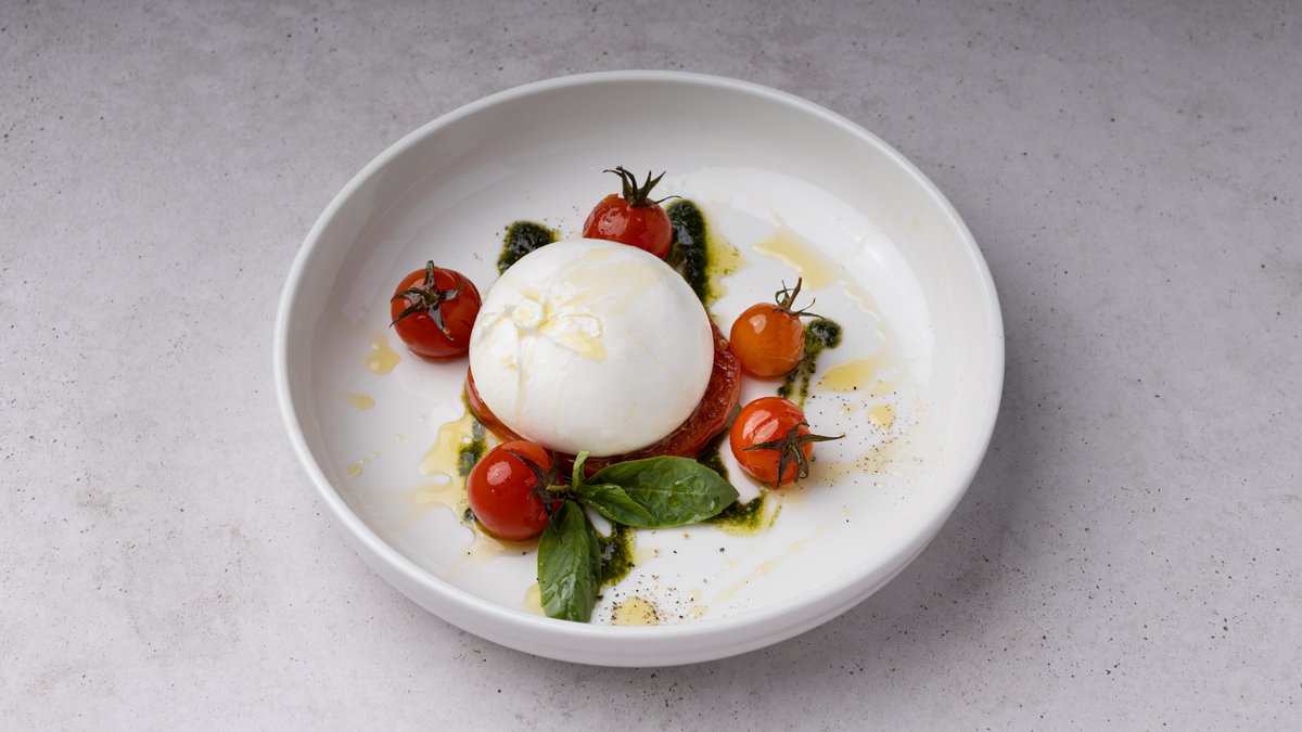 mit Büffel-Burrata, Tomaten, Rucola Basilikum und Olivenöl