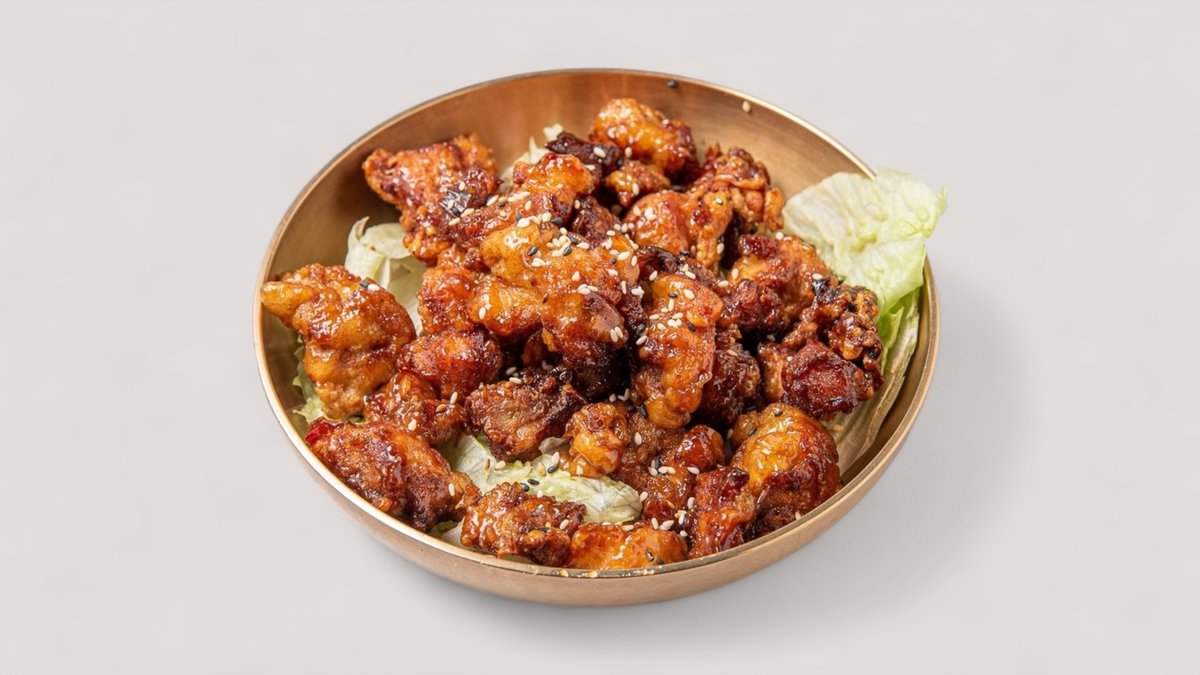 leicht scharf knusprig frittierte Hähnchenteile in hausgemachter Süß-Soja-Knoblauch-Soße mit Sesam