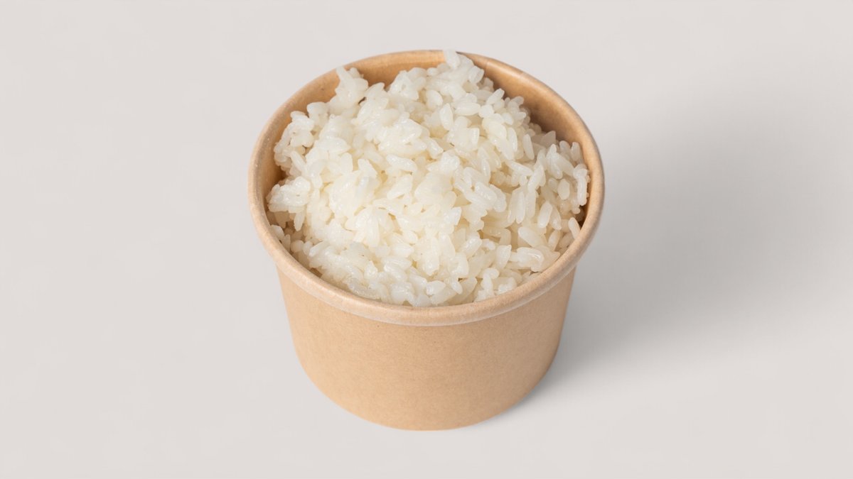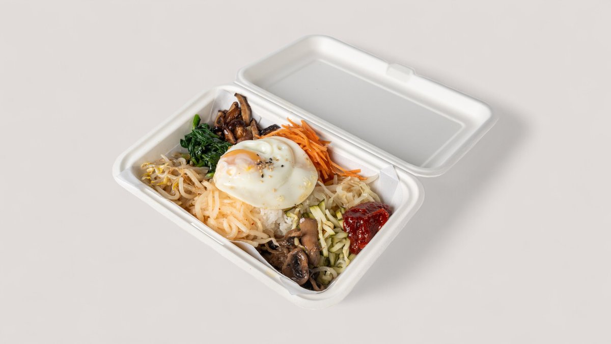 scharf & vegetarisch Reis in einer Schüssel mit verschiedenem Gemüse, serviert mit Chili-Knoblauch-Soße dazu, Lauwarm. auf Wunsch mit Extras erhältlich