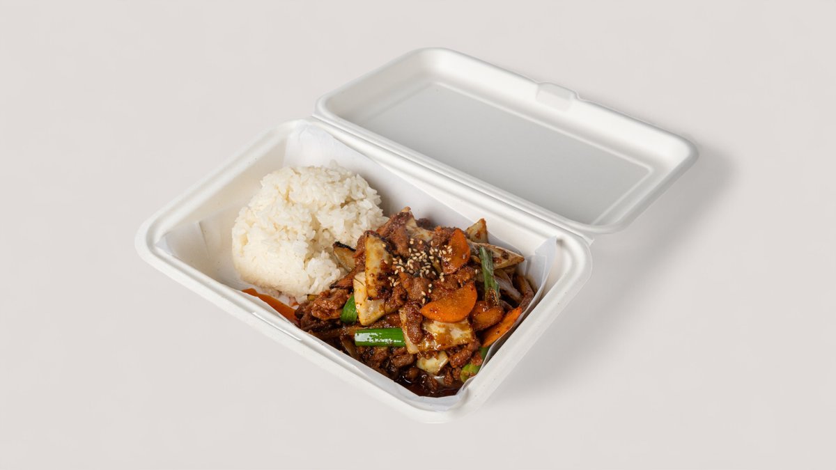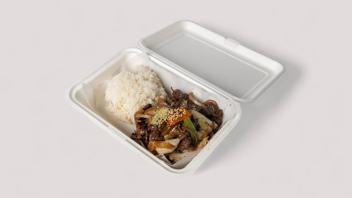 marinierte Rindfleischscheiben in hausgemachter Sojasoße gebraten mit Gemüse, serviert mit Reis