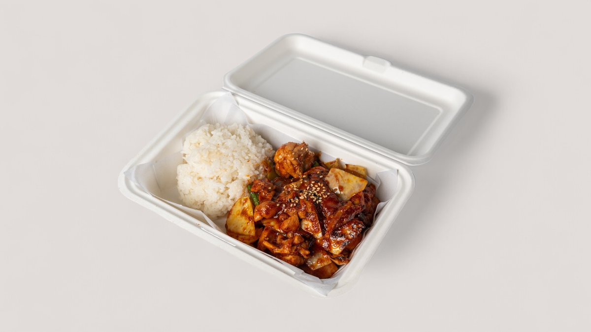 scharf mariniertes Hähnchenteile gebraten mit Gemüse, serviert mit Reis