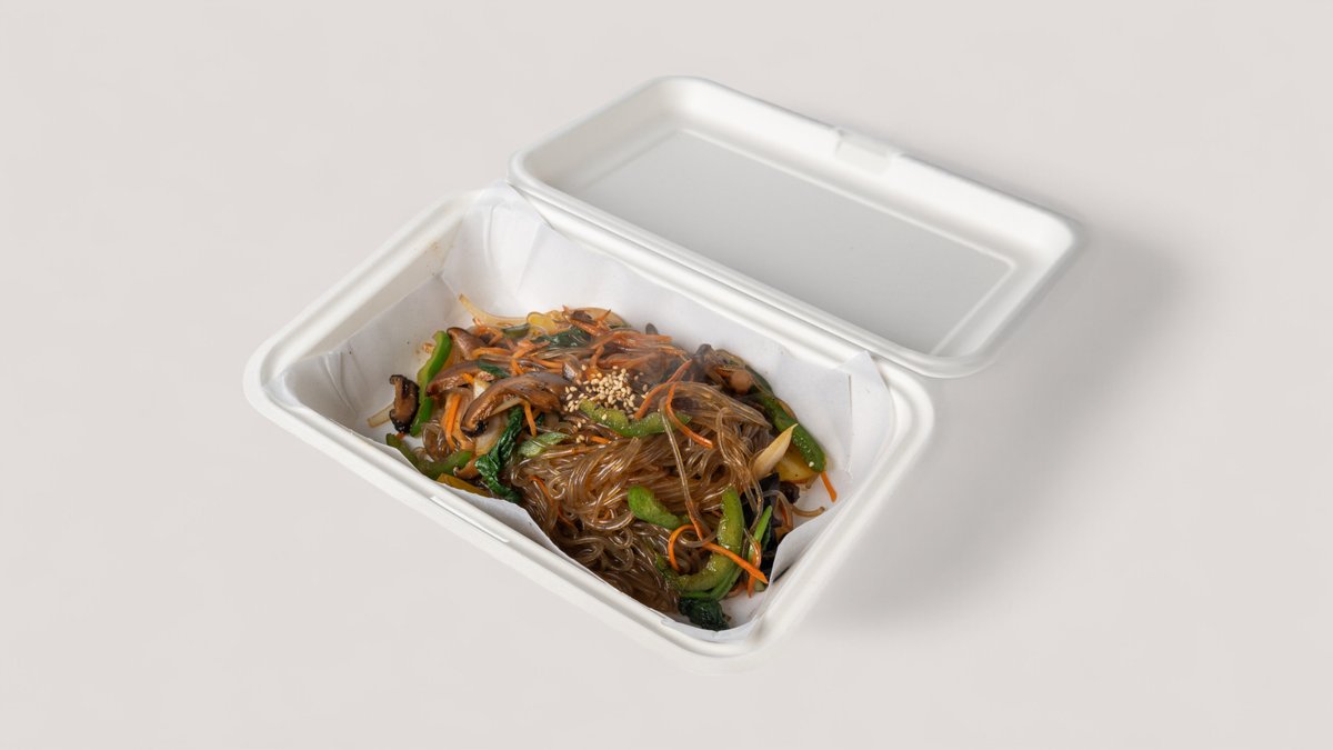 vegetarisch Glasnudeln aus Süßkartoffeln mit Zwiebeln, Paprika & Pilzen in Soja-Sesamsoße gebraten auf Wunsch mit Extras erhältlich