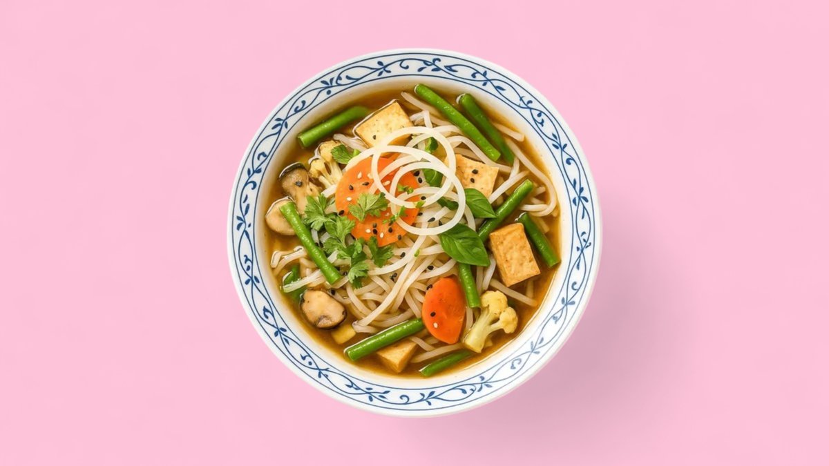 Gemüsesuppen-Spezialität mit Reisbandnudeln, Tofu, Pilzen, Zwiebeln, Rettich, Basilikum und Koriander