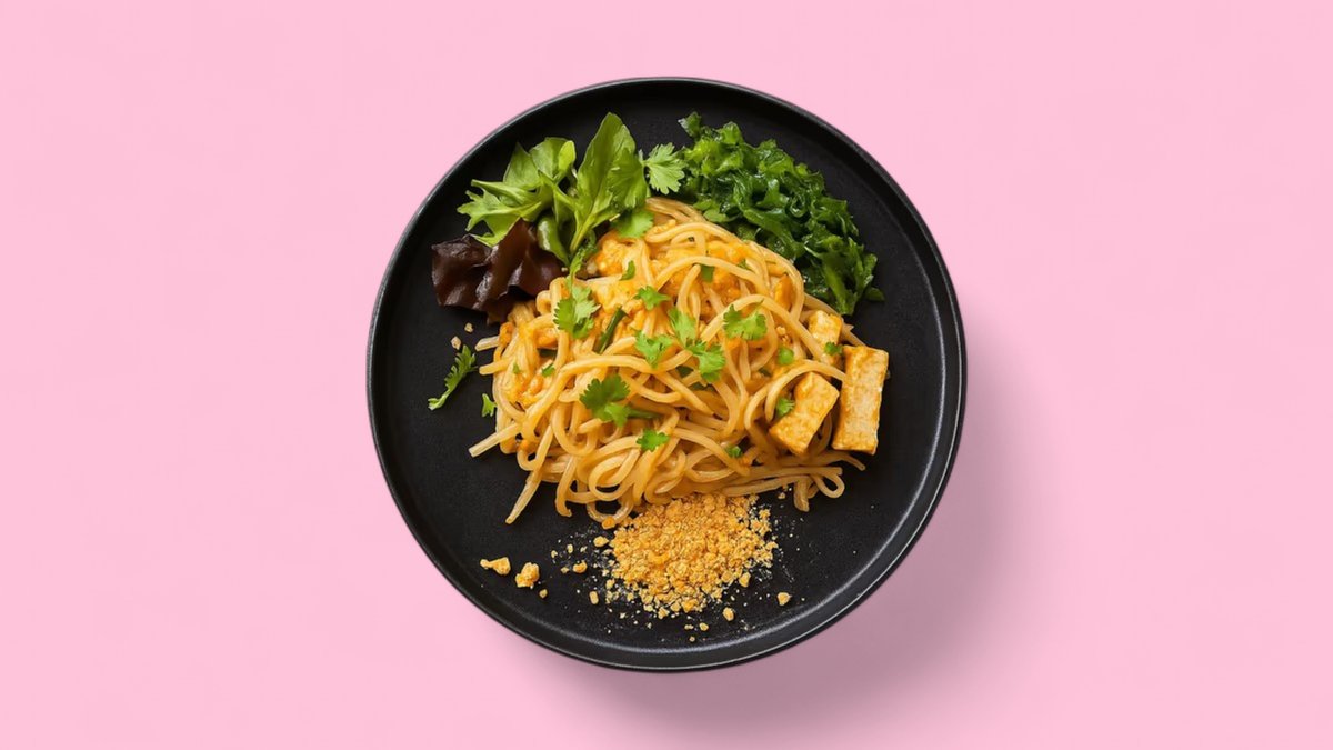 gebratene Reisbandnudeln mit Tofu, Knoblauch, Sojasprossen, gerösteten Zwiebeln, Korriander und Erdnüssen