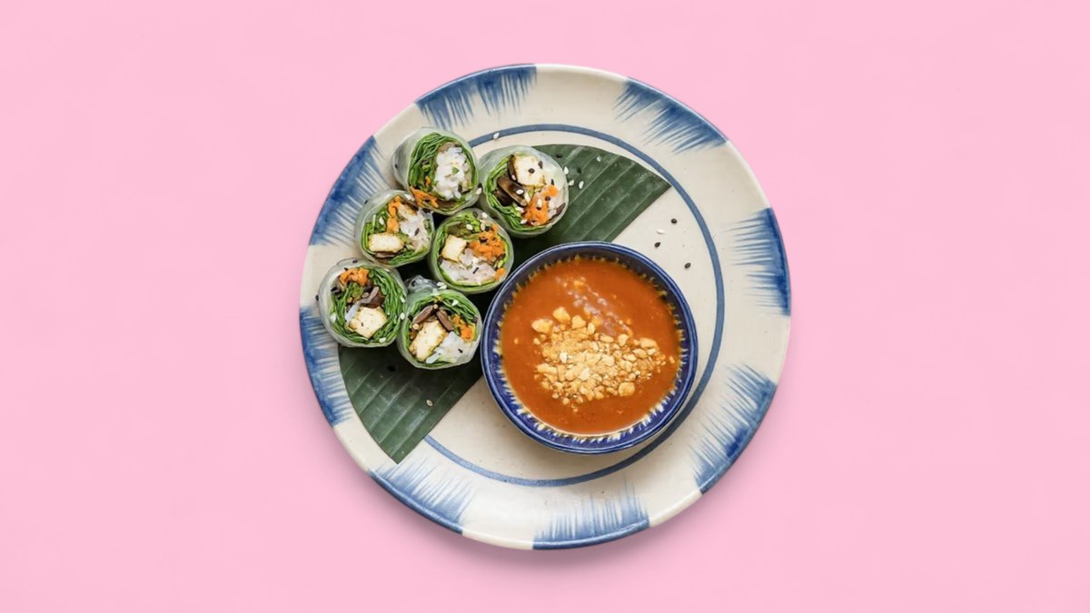 2 Stück gefüllte Herbstrollen mit Tofu, Pilzen, Reisnudeln und frischem Salat, dazu hausgemachter Erdnusssoße