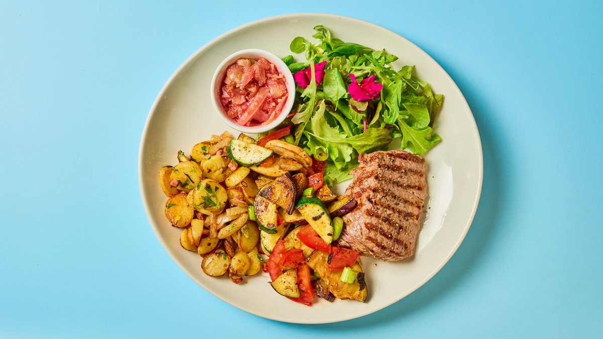 ca. 200 g mit Rotwein-Schalotten, Bratkartoffeln und frischem Gemüse Enthält Alkohol, für Kinder und schwangere Frauen nicht geeignet