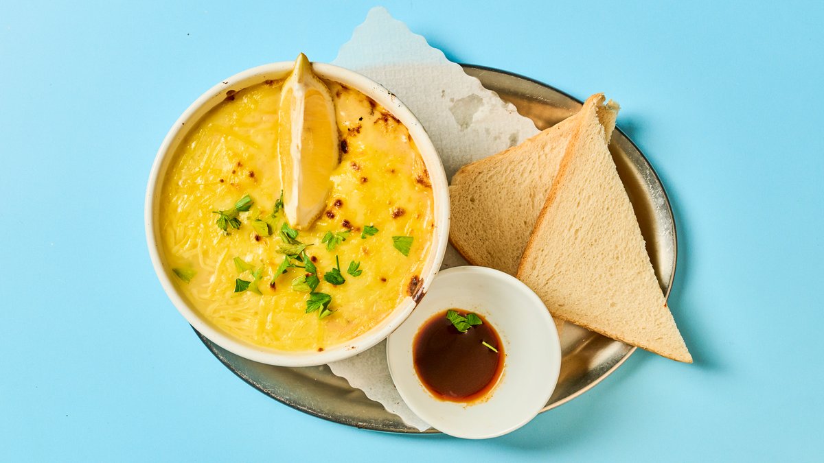 Schwein, Rinderbrühe, Weißwein, Gewürze, mit Käse überbacken und Weißbrot Enthält Alkohol, für Kinder und schwangere Frauen nicht geeignet