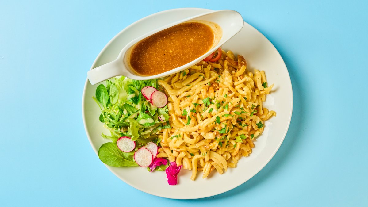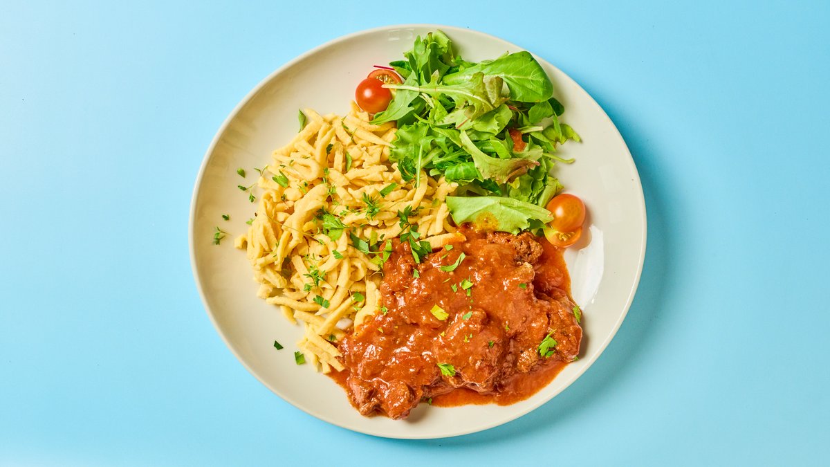 rosa gebraten, mit Spätzle und kleinem gemischten Salat