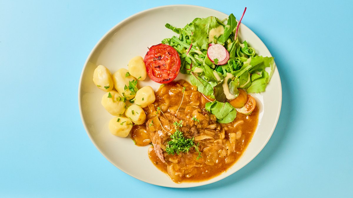mit Dunkelbiersoße, Salzkartoffeln und Krautsalat Enthält Alkohol, für Kinder und schwangere Frauen nicht geeignet