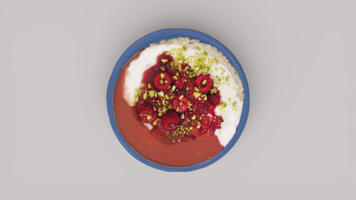 warmer Porridge mit Kokosjoghurt, marinierten Himbeeren, Erdbeerpüree und gehackten Pistazien