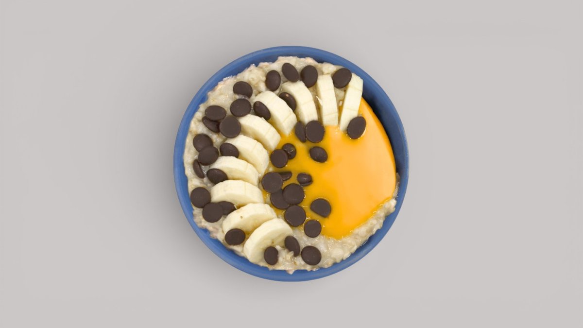 warmer cremiger Porridge, mit Mangopüree, Banane und Schokodrops.