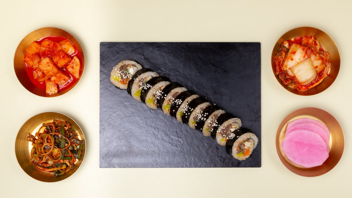 mit mariniertem Rind, Spinat, Ei, Karotten, Rettich und Spitzkohl, eingerollt in Reis und geröstetem Seetangsalat