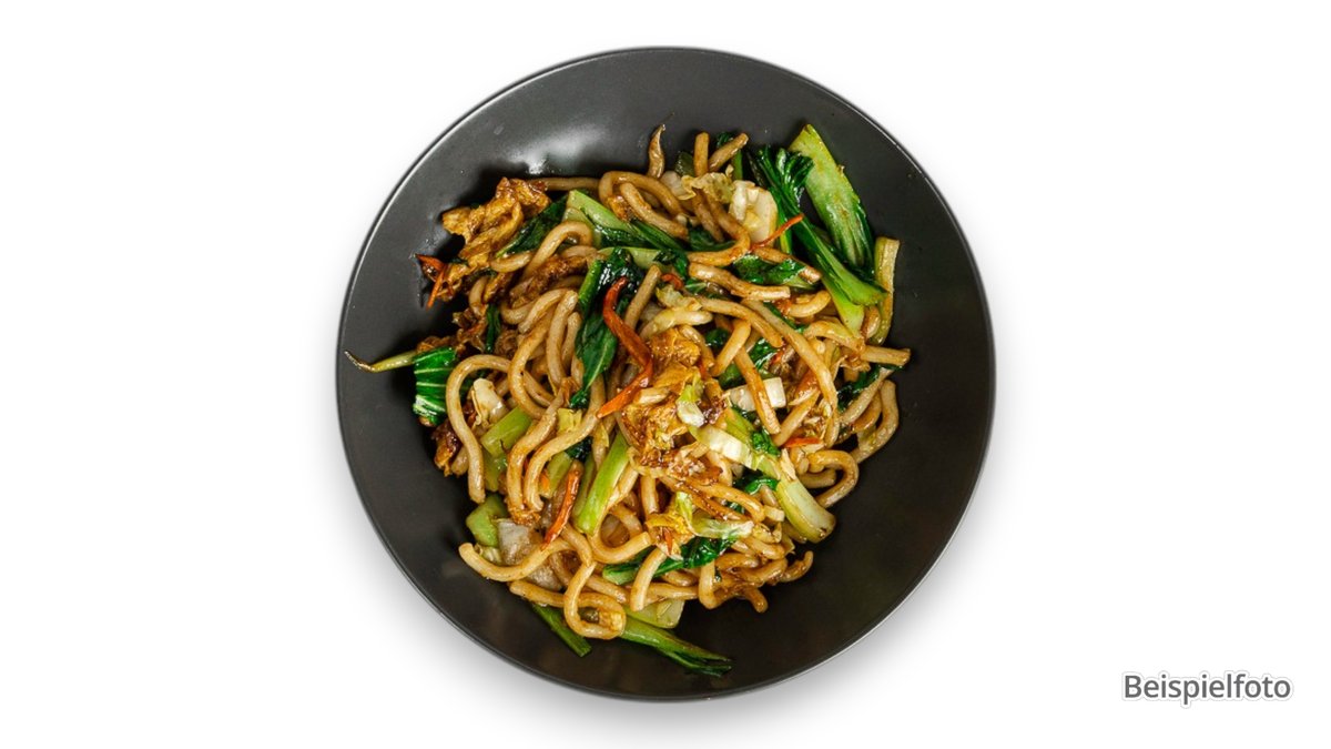 gebratene Udon-Nudeln mit Gemüse, Kräutern, Röstzwiebeln