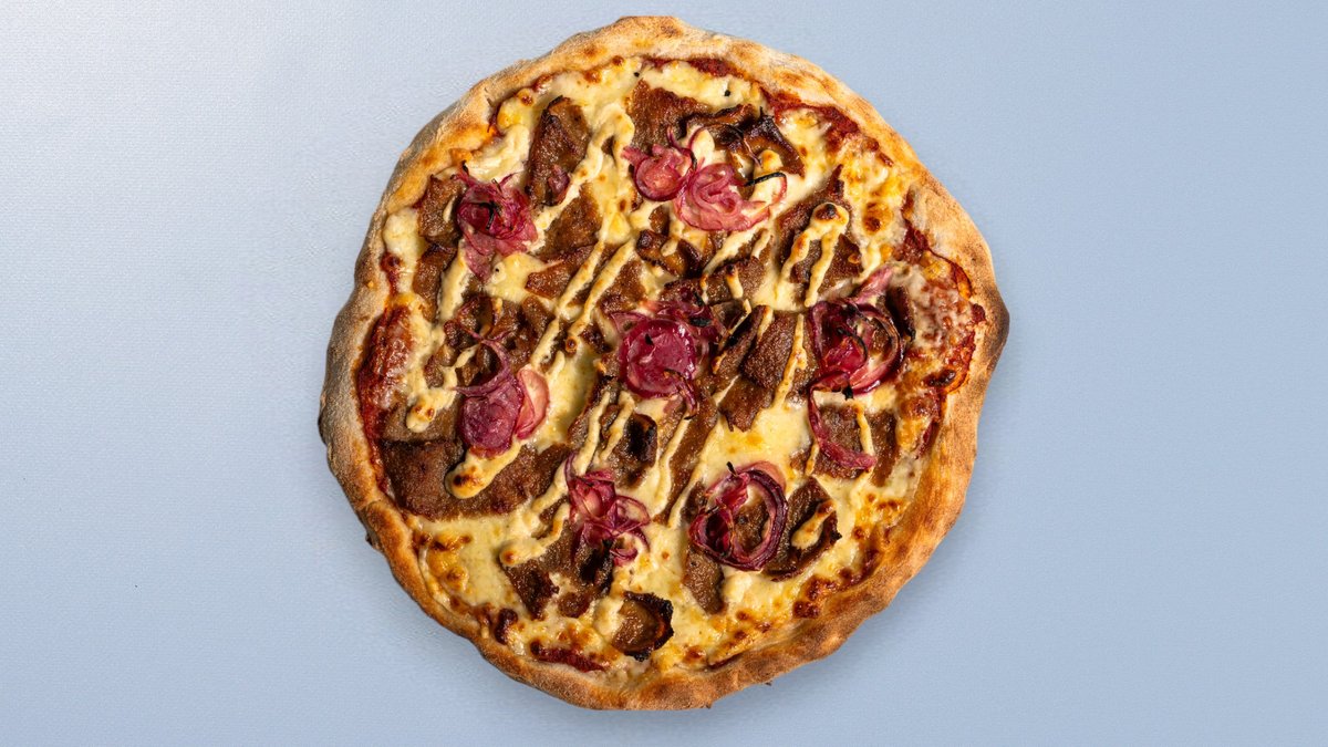 Handgezogene Pizza aus italienischem Sauerteig, Thymian-Oregano Tomatensauce, Mozzarella- Gouda Käse Mix, HALAL Rinder- und Puten- Döner, Garlic Creme und eingelegten roten Zwiebeln