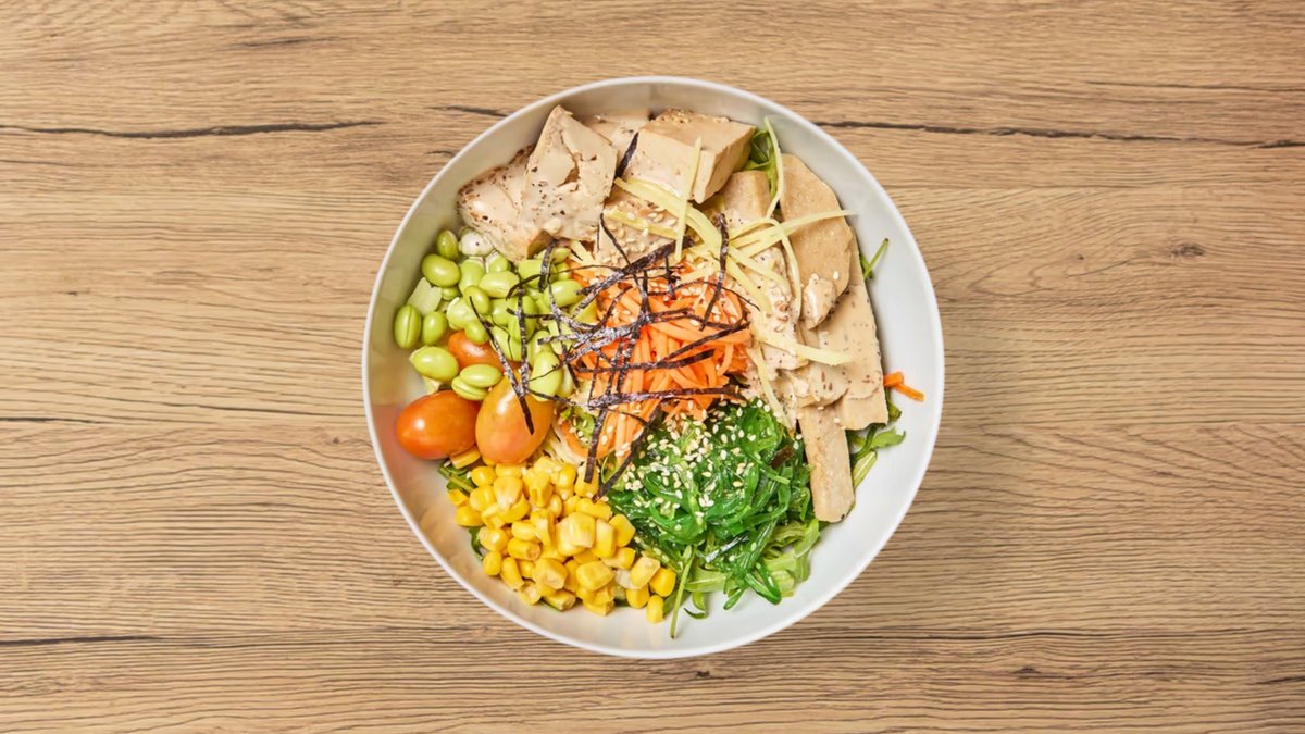 mit Tofu, Wakame-Salat, Edamame, Tomaten, Salat, Karotten, Mais, Ingwerstreifen, Sesam, Seetangsalat, Soja-Sesam-Soße und Reis mit Buchweizen
