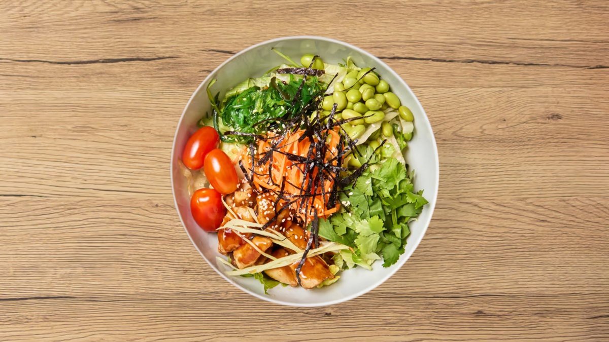 mit Hühnerfleisch, Wakame-Salat, Edamame, Tomaten, Karotten, Sesam, Koriander, Ingwerstreifen, Teriyaki Soße und Reis mit Buchweizen