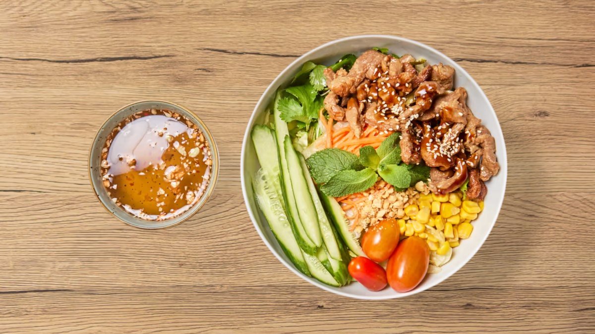 mit würzig gegrilltem Schweinefleisch, Gurke, Tomaten, Karotten, Röstzwiebeln, Erdnüsse, Minze, Koriander, Fischsoße und Reis mit Buchweizen