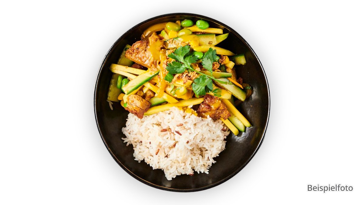 Pak Choi mit Mango-Julienne, frischen Kräutern, Koriander, gerösteten Erdnüssen, Röstzwiebeln, Fischsoße-Mango-Dressing und Jasminreis und einer Zutat deiner Wahl