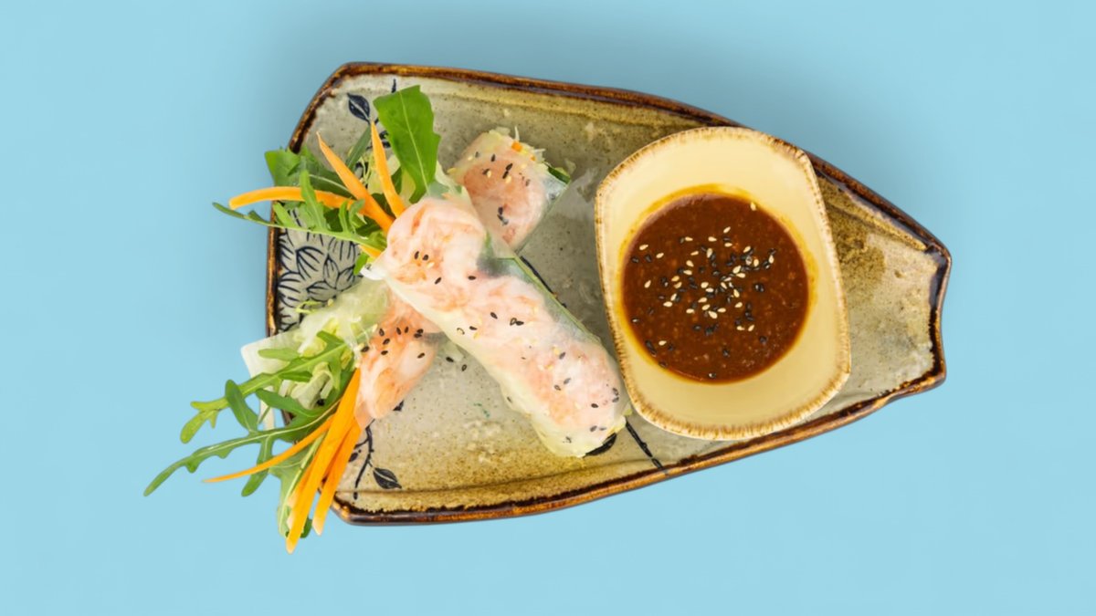 2x knusprige Frühlingsrollen mit frischem Salat, Reisnudeln, Hoisin-Erdnussmix und einer Zutat deiner Wahl