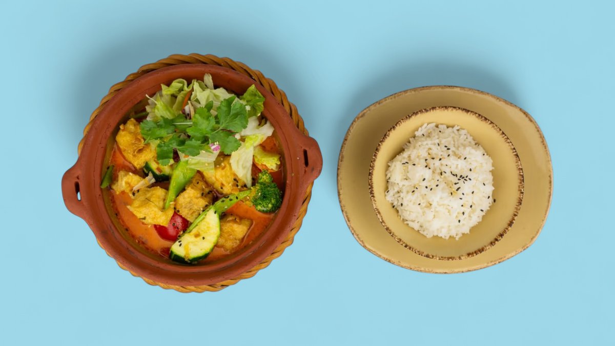 scharfer Seitanfilet in Sate-Butter-Soße mit Kimchi, Karotten, Blumenkohl, Brokkoli, Zucchini, Bohnen, Paprika, Ingwer, frischem Kräutersalat, Koriander, geröstetem Sesam und Jasminreis