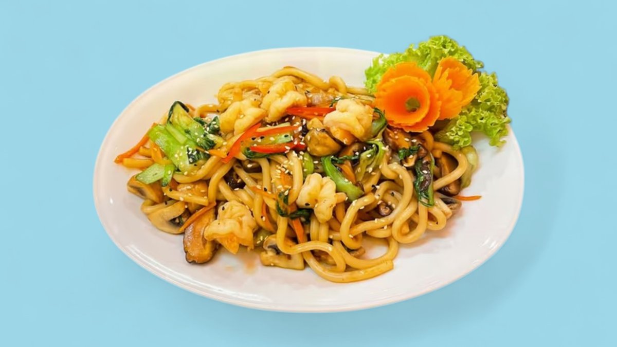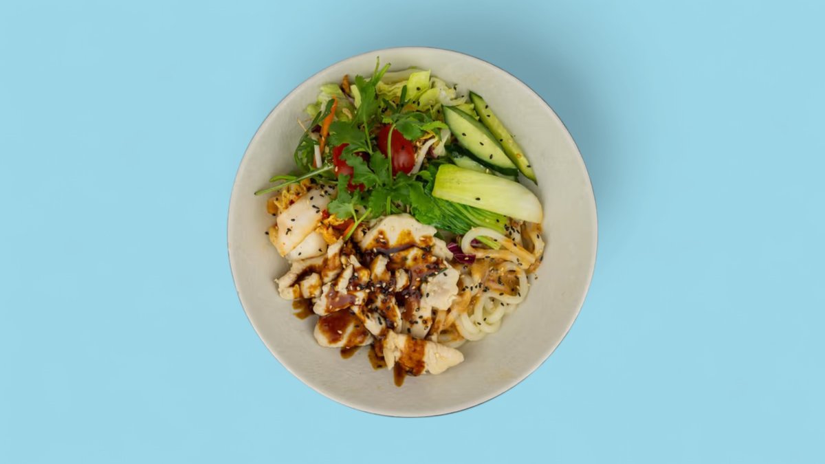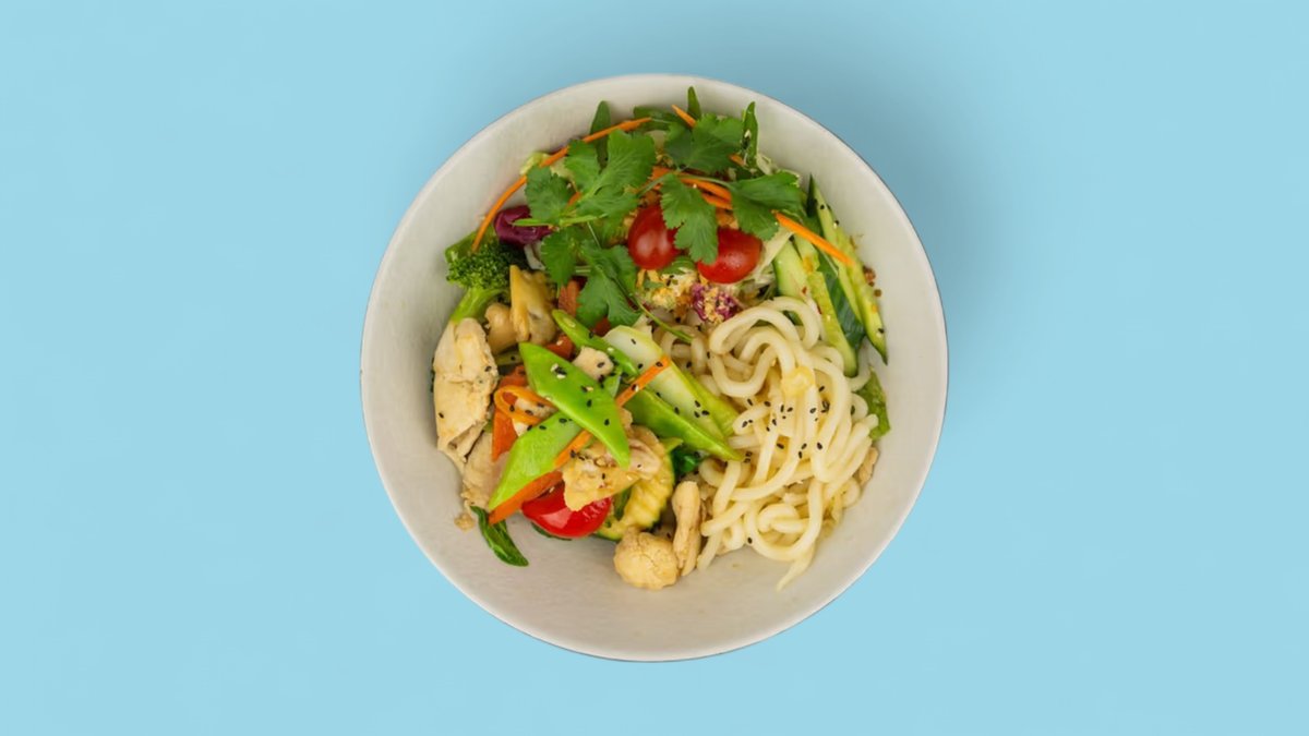 mit Szechuanpfeffer, Pak Choi, Shiitake, Karotten, Blumenkohl, Brokkoli, Zucchini, Bohnen, Paprika, frischem Kräuersalat, gedämpftem Udon, übergossen, herzhafter Austernsoße, Koriander, geröstetem Sesam und Erdnüssen und einer Zutat deiner Wahl