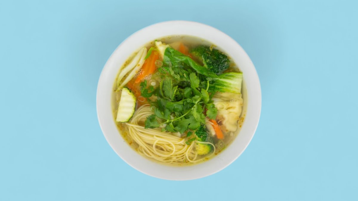5x traditionelle Kräuter-Brühe mit Reisbandnudeln, Lauchzwiebeln, frischem Koriander und Sojasprossen und einer Zutat deiner Wahl