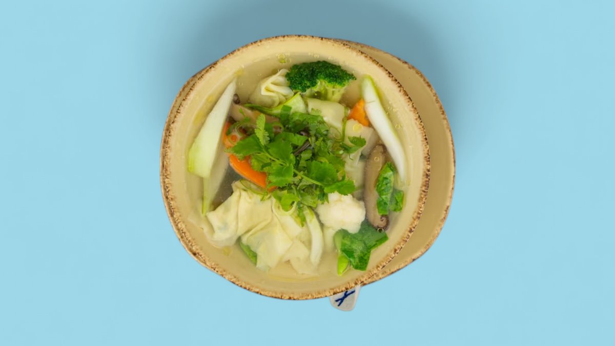 hausgemachte Wan Tan mit einer würziger Hähnchen-Hackfleischfüllung, Pak Choi, Karotten, Zucchini, Brokkoli, zarten Eiernudeln, Lauchzwiebeln, frischem Koriander, Sojasprossen und Sesamöl
