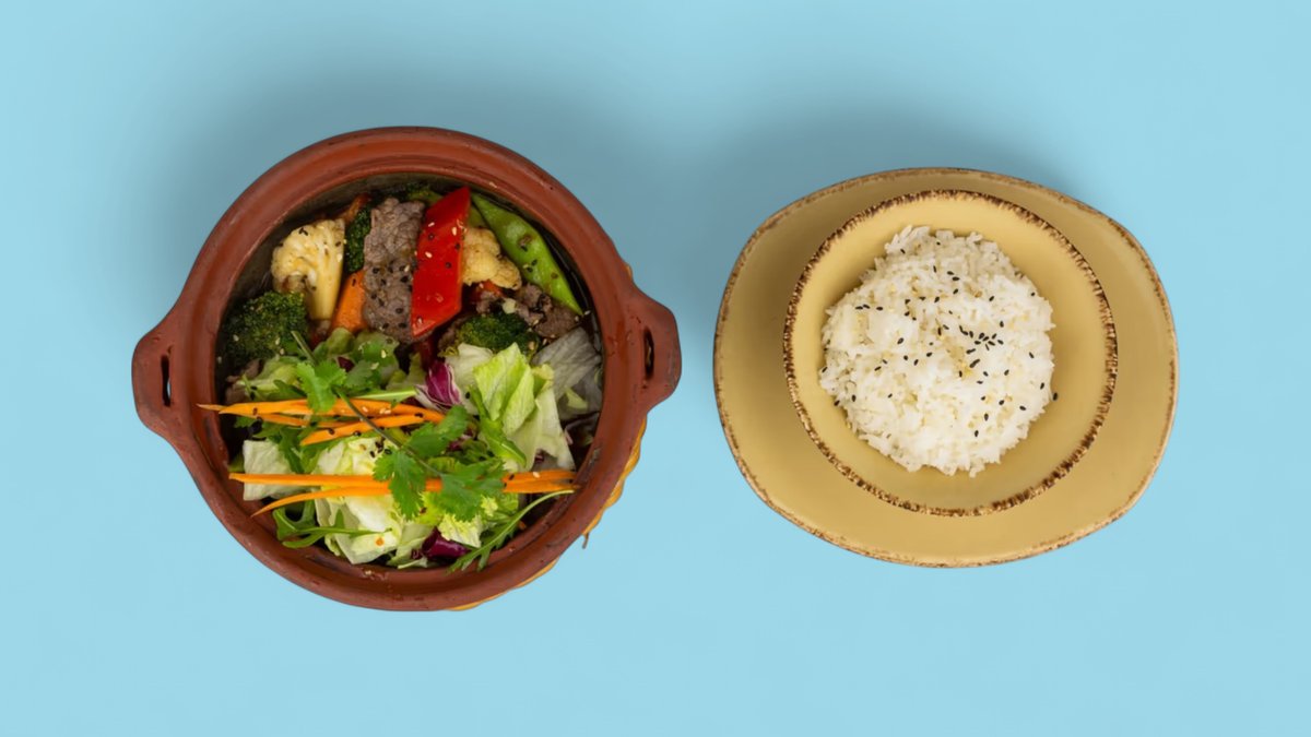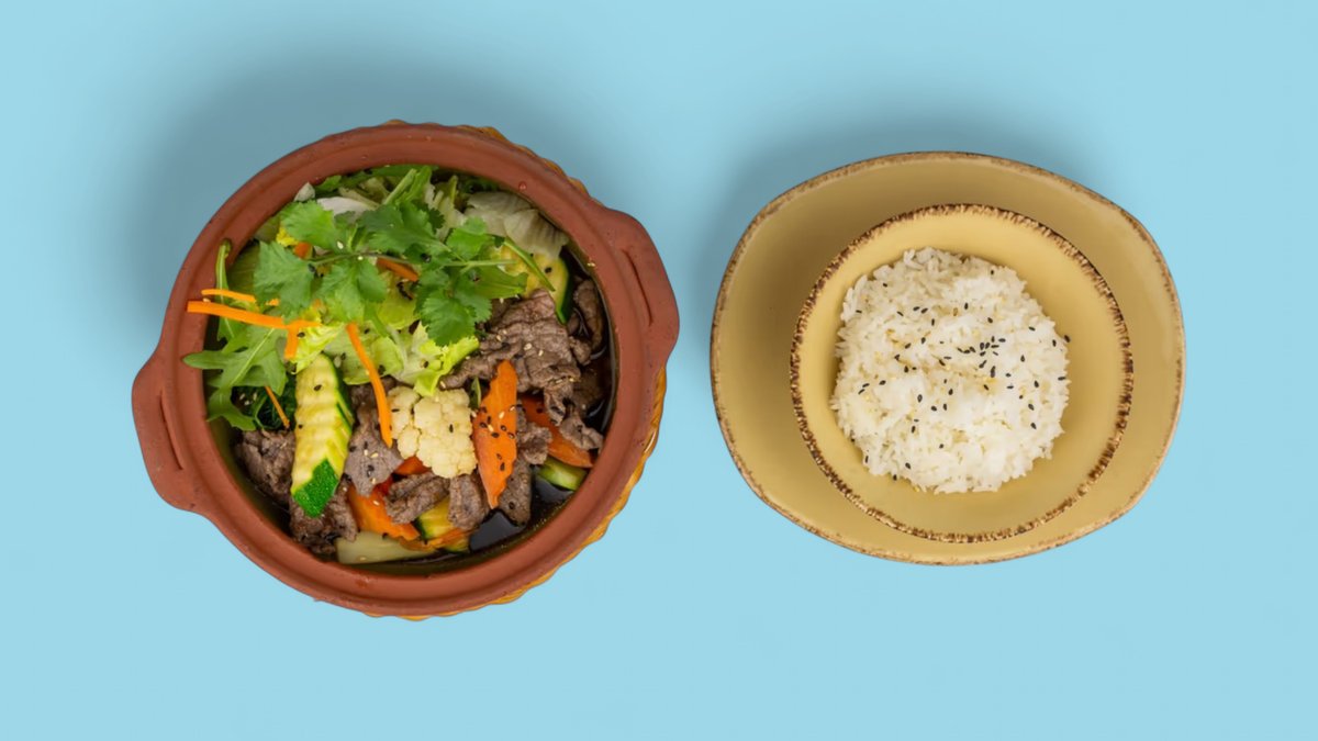 dunkle Pfeffersoße mit Rinderspitzen, Karotten, Blumenkohl, Brokkoli, Zucchini, Bohnen, Paprika, frischem Kräutersalat, Koriander geröstetem Sesam und Jasminreis und einer Zutat deiner Wahl