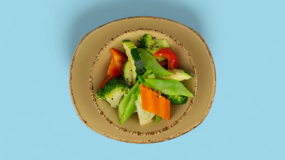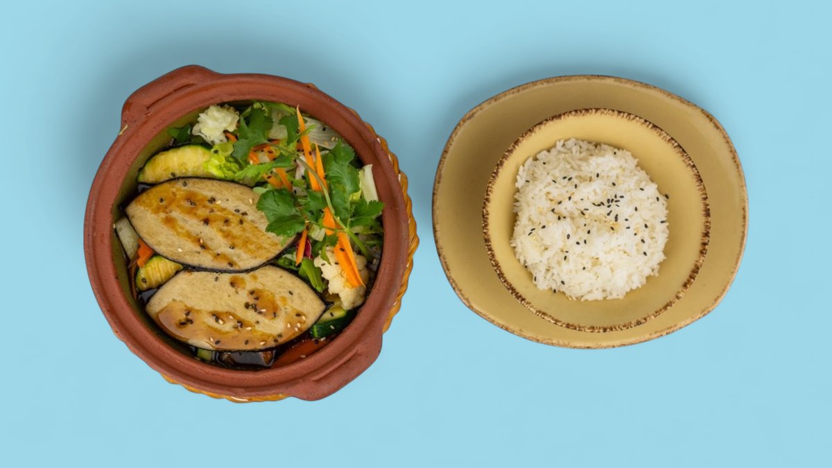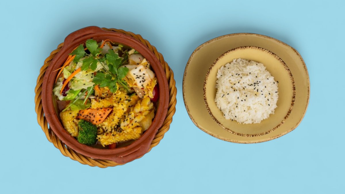 mit Karotten, Blumenkohl, Brokkoli, Zucchini, Bohnen, Paprika, frischem Kräutersalat, Koriander, geröstetem Sesam und Jasminreis und einer Zutat deiner Wahl