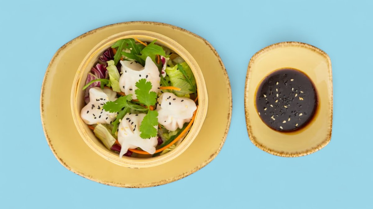 4x gedämpfte Teigtaschen mit Garnelen und Unagi-Sesam-Dip