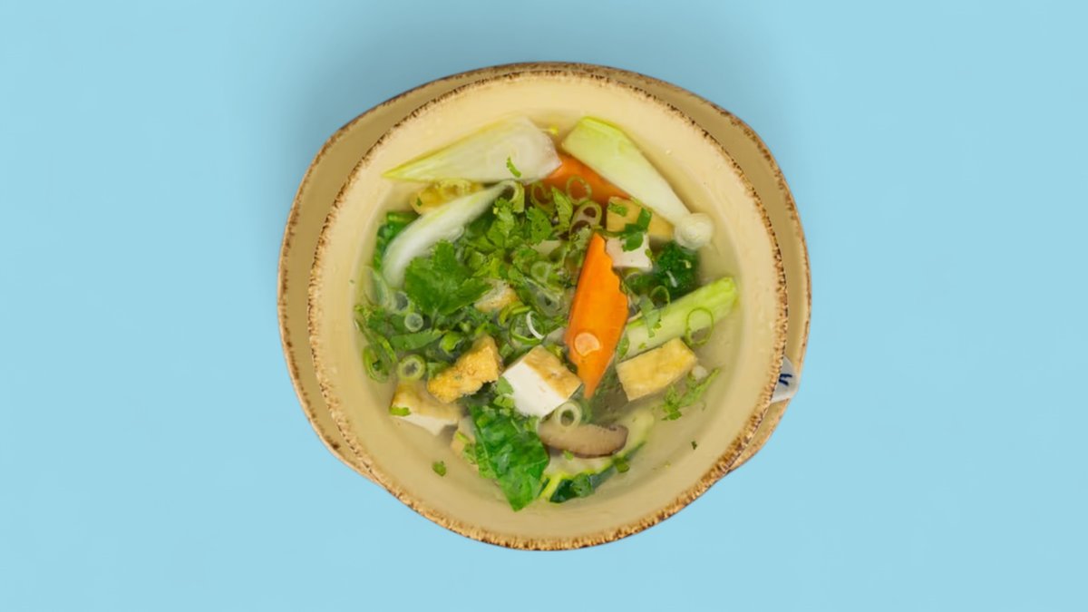 5x traditionelle Kräuter-Brühe mit Reisbandnudeln, Seitan, Tofu, Shittake, Lauchzwiebeln, frischem Koriander und Sojasprossen