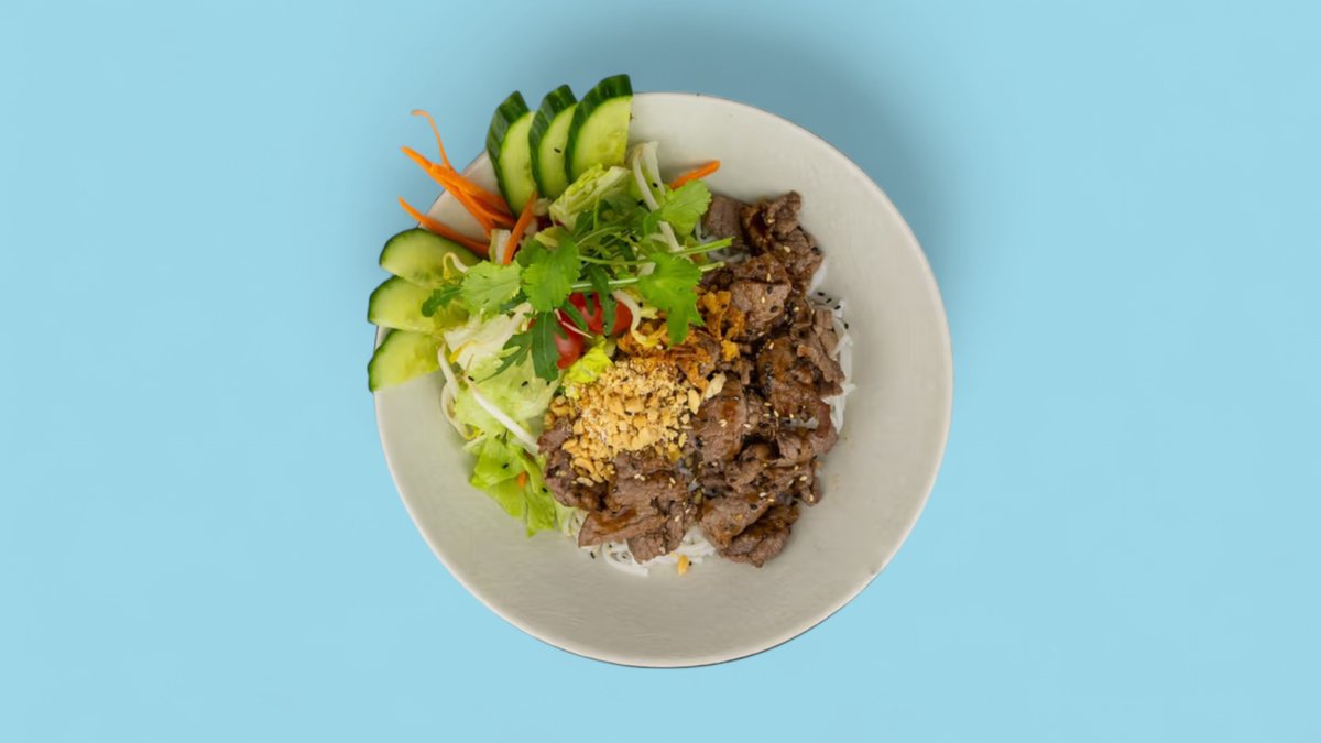 mit Chili, Zitronengras, Reisnudeln, frischem Salat, verschiedenen Kräutern, Kirschtomaten, Gurken, Erdnüssen, Limetten-Fischsoße, Röstzwiebeln, Koriander und geröstetem Sesam und einer Zutat deiner Wahl