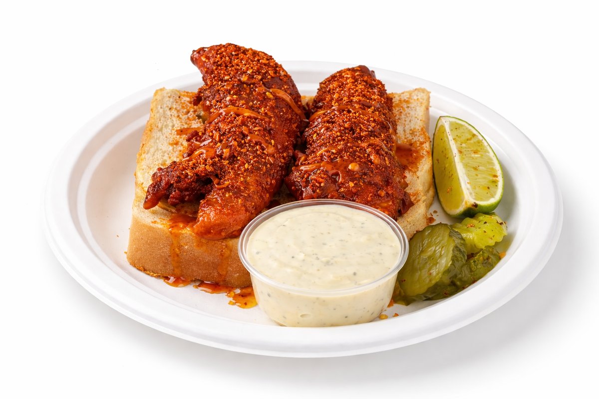 (mild, hot, very hot) Knusprige Nashville Chicken Tenders mit Hot Honey, cremigem Ranch-Dressing, Dill-Pickles und frischer Limette.