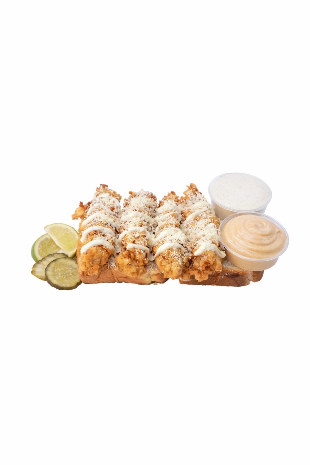 Ranch Parm Chicken 4 knusprige Nashville Chicken Tenders, verfeinert mit hausgemachter Ranch-Sauce und großzügig mit frisch geriebenem Parmesan vollendet – cremig, würzig und unwiderstehlich.