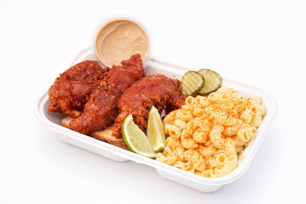 • Mac & Cheese • 3× Hot Honey Chicken Tenders • Gegrilltes Weißbrot • Hot-Honey-Dressing • Limetten & Dill-Pickles