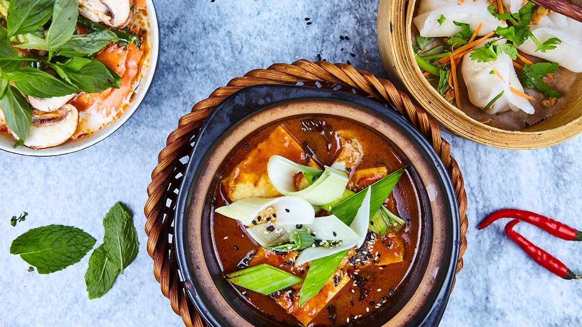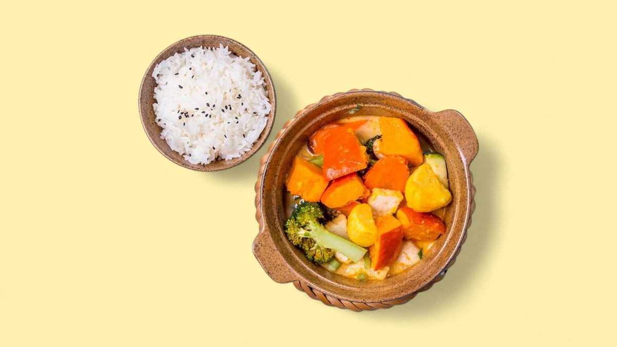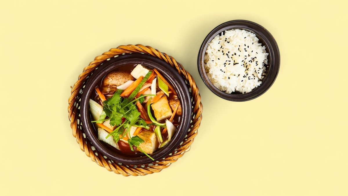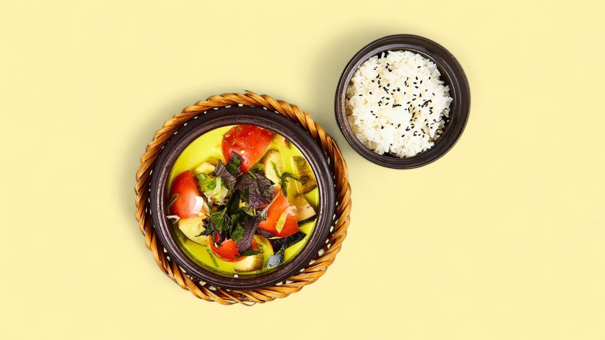 hausgemachtes Curry aus pikanter roter Curry-Kokos-Suppe im Tonkopf mit zartem Seidentofu und frischem GemĂĽse