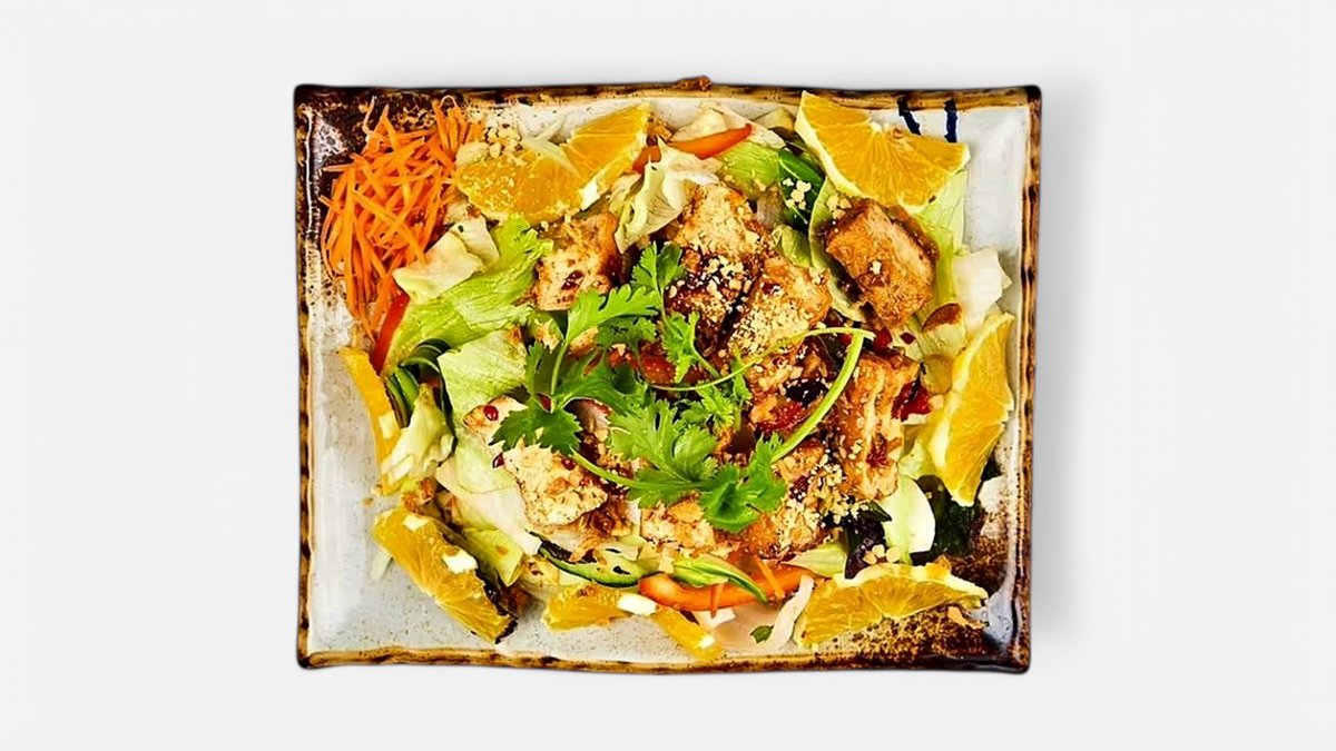 Tofu und Seitan mit pikantem Pak-Choi, Orangen, buntem Salat, verschiedenen Kräutern, Salat-Dressing, Röstzwiebeln und Erdnüssen