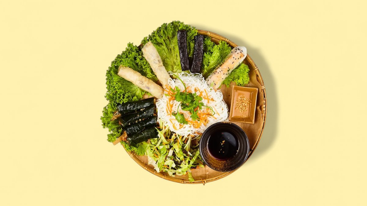 marinierter Tofu umwickelt in Seetangblättern mit Reisnudeln, frischem Salat, Kräutern & hausgemachtem Dressing