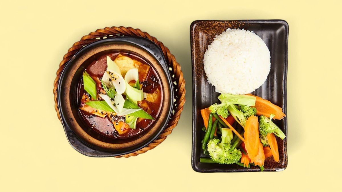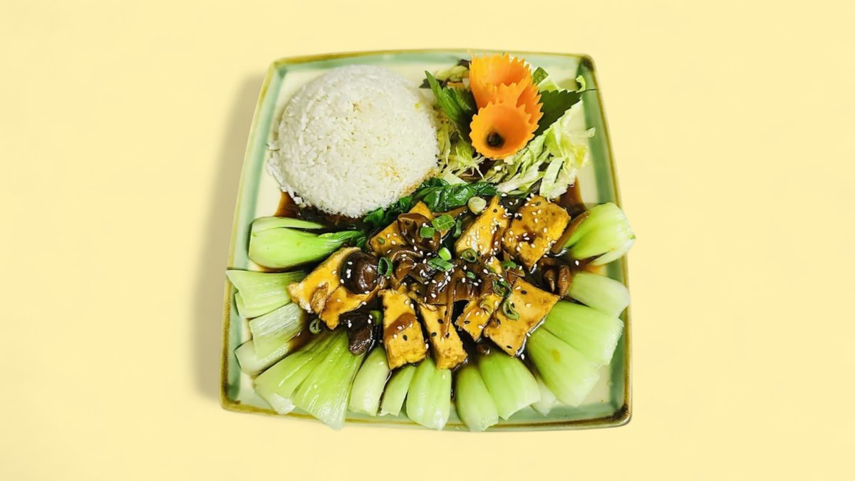 gedämpfter Reistopf mit karamellisiertem Tofu, Austernpilze und verschiedenem Gemüse