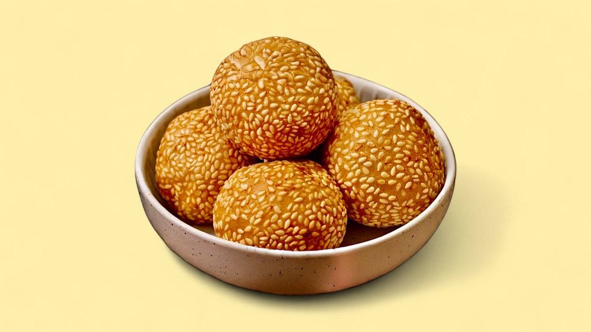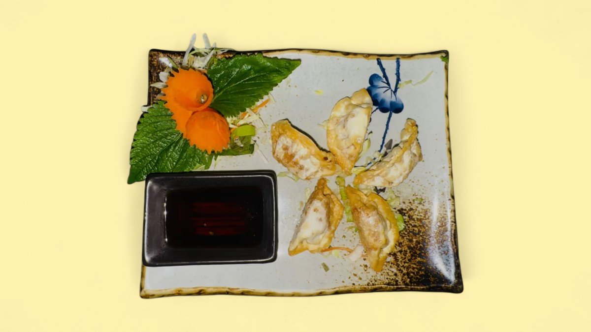 5 StĂĽck gebackene Teigtaschen gefĂĽllt mit zartem Tofu, Morcheln und SojasoĂźe