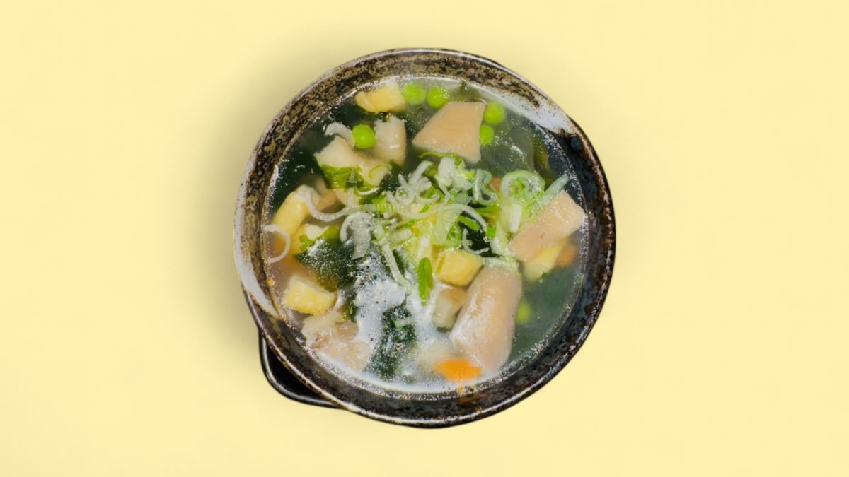 Traditionell vietnamesische Gemüsesuppe mit Mais, Champignons, Möhren, Erbsen, Morcheln, Duftpilzen und Tofu