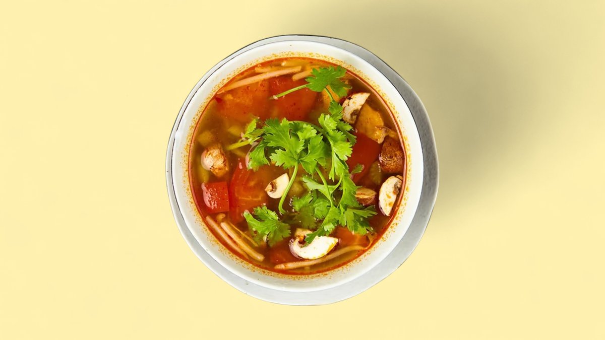 süß-saure Suppe traditionelles vietnamesisches Art mit zartem Tofu, Tomaten, Champignons, Tamarinde und frischen Kräutern verfeinert