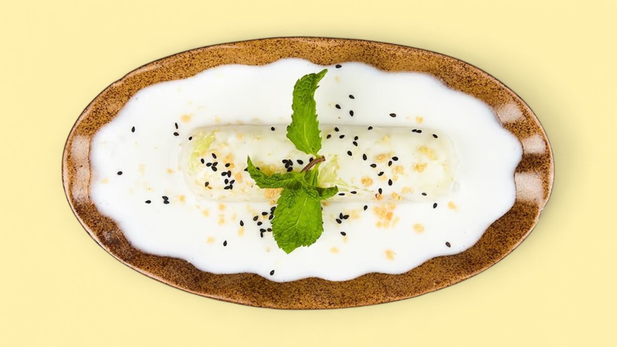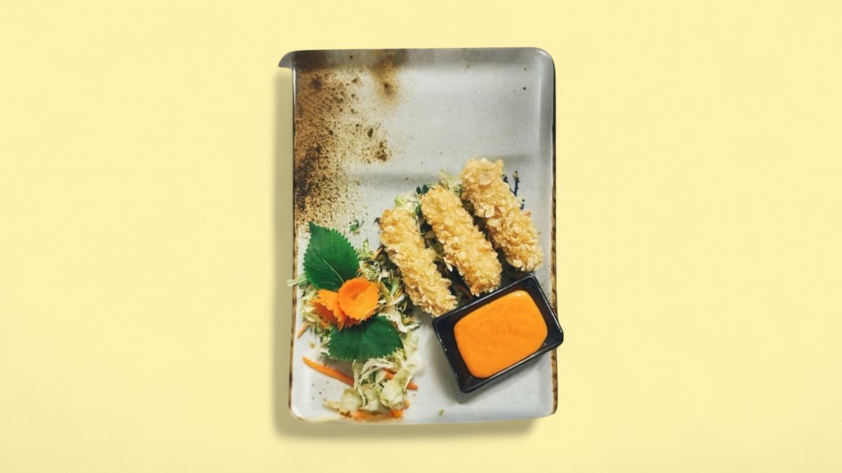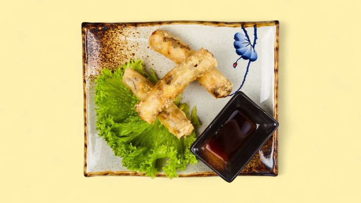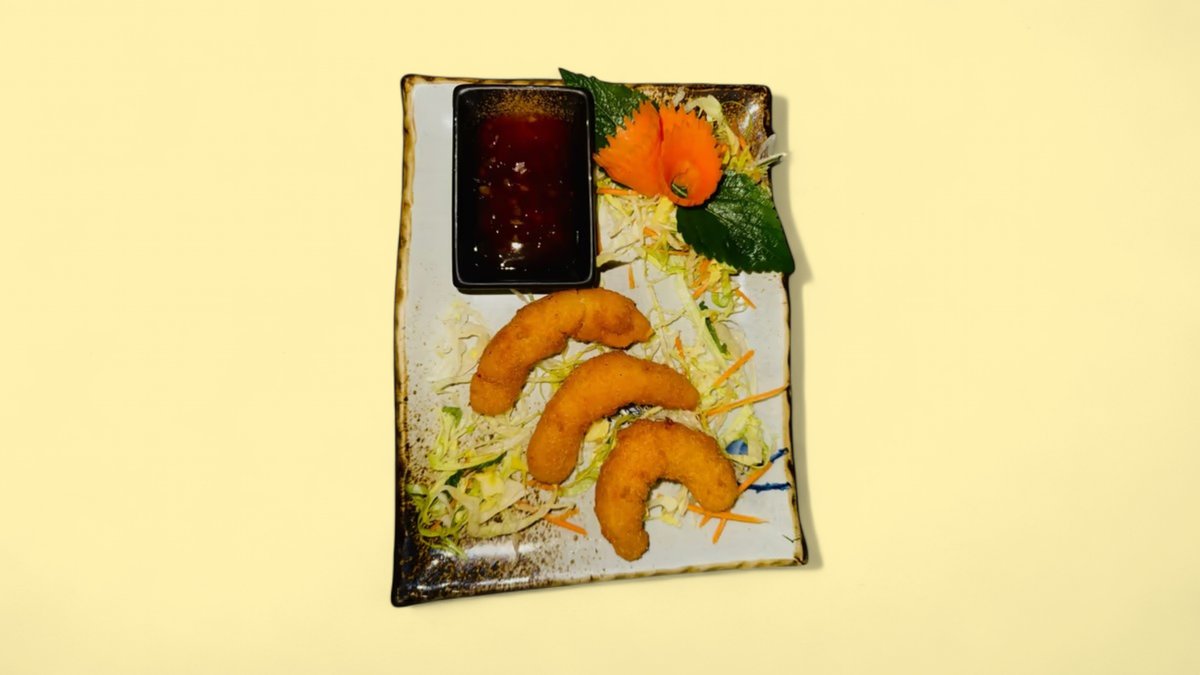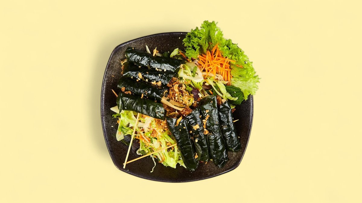 knuspring fritierte Seetanggrillen gefĂĽllt mit glassnudeln Karotten und Zwiebeln, seviert mit Hausgemachte