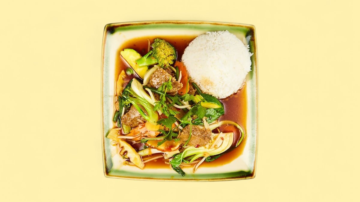 mit verschiedenem gebratenem GemĂĽse und aromatisierten Sojastreifen in dunkler SoĂźe