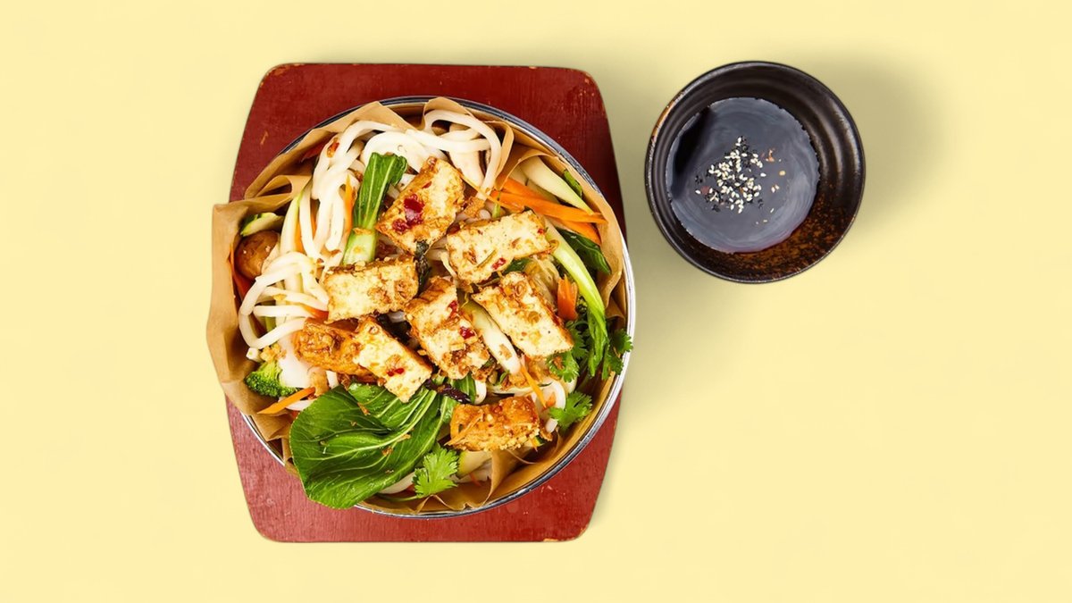 gebratene feine Udonnudeln mit mariniertem Tofu, frischem Gemüse und aromatischen vietnamesischen Kräutern