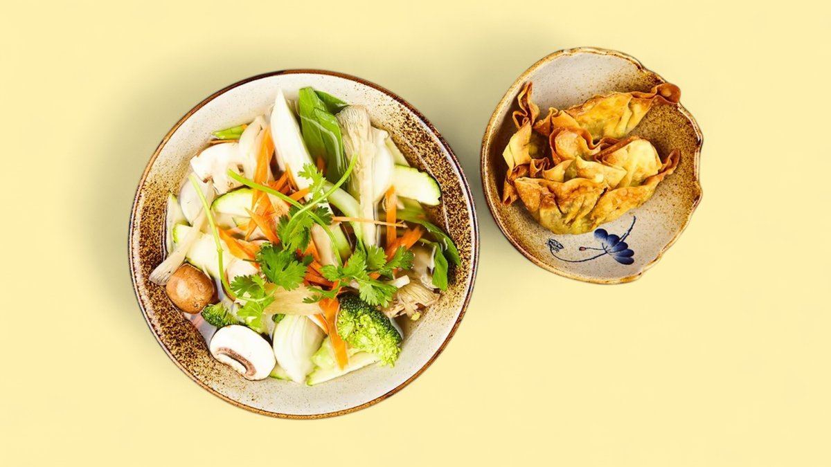 große Teigtaschen mit Tofu, Nudeln, Gemüse, Morcheln, Röstzwiebeln und verschiedenen Kräutern