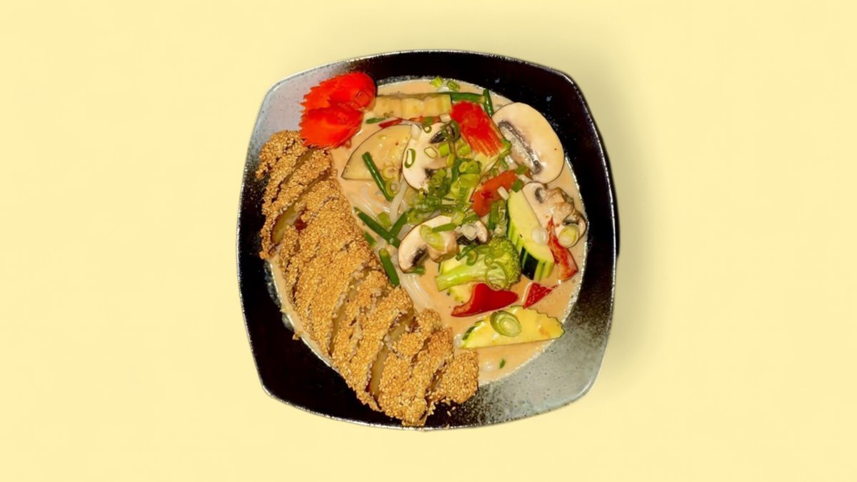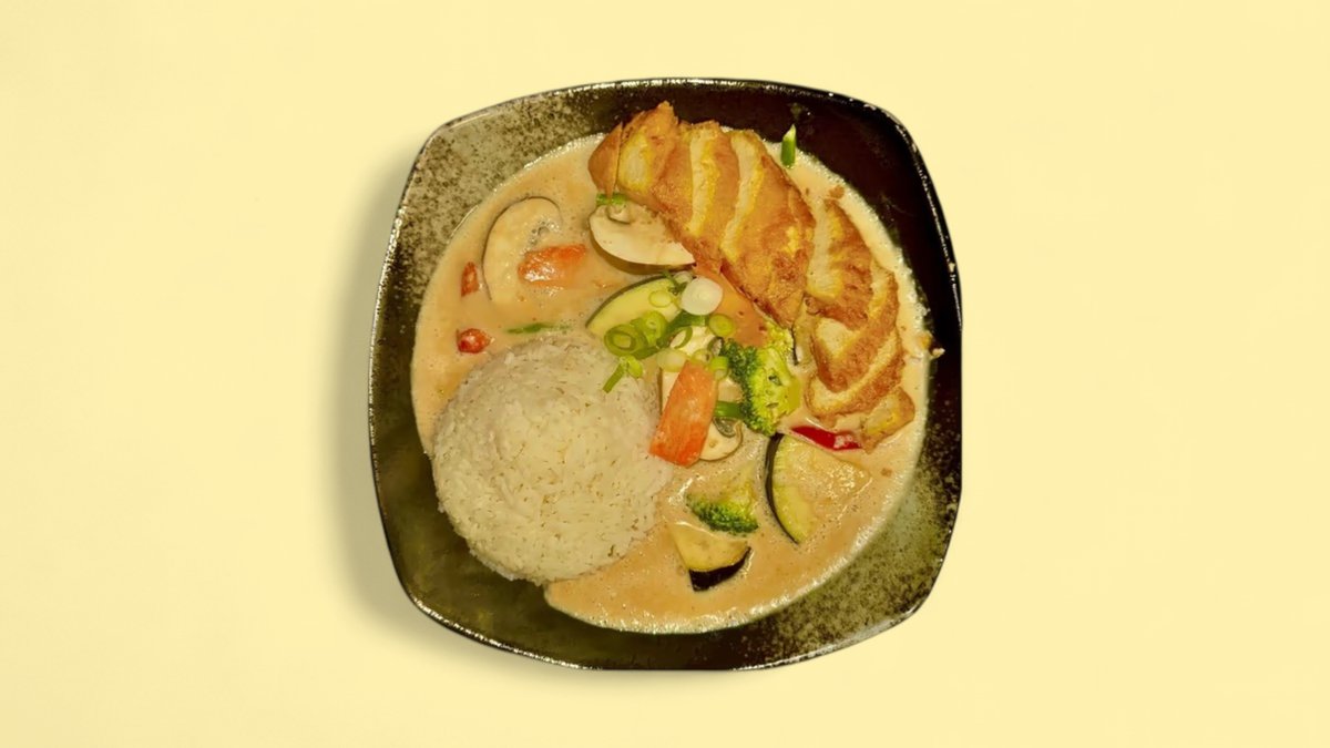 Hausgemachtes roter Curry-Kokos-SoĂźe mit Knusprig Chicken ( vegan) , Pilze und Frischen GemĂĽse Serviert mit Reis oder Udon Homemade red curry coconut sauce with crispy schicken (vegan) , mushrooms and vegetables served with rice or udon /homemade red curry coconut sauce with crispy chicken (vegan), mushrooms and fresh vegetables. Served with rice or udon.