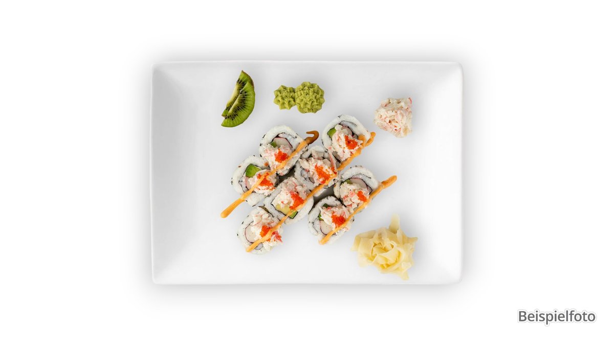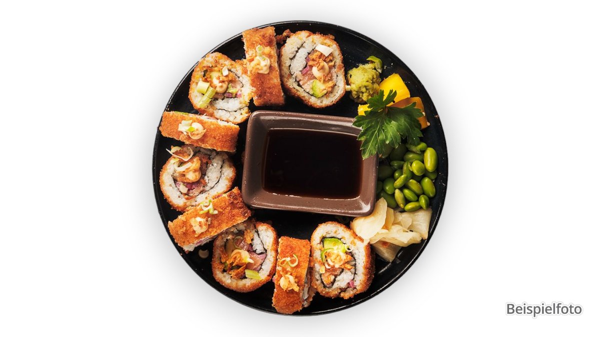 mit Lachs, Thunfisch, Edamame, Wakame, Rucola, Gurken und Paprika